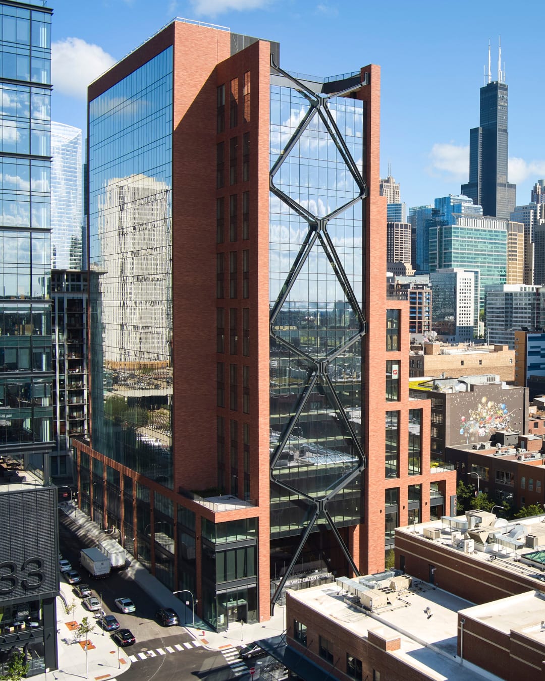 800 W Fulton Market stands as a 19-story architectural masterpiece in Chicago's dynamic Fulton Market District. This SOM-designed LEED Platinum property offers 474,000 RSF of premium office and retail space, blending contemporary luxury with historic neighborhood character. The building's striking facade features iconic X-bracing and nine stepped terraces with native plantings. Inside, a dramatic 40-foot lobby showcases a cantilevered staircase and mezzanine, leading to expansive floor plates for flexible office layouts. Operational excellence extends to premium amenities including a fitness center, bike storage, game room, multiple event spaces, and exterior terraces with stunning city views. Superior building management ensures peak performance while maintaining exceptional tenant experience. The building holds WELL-Core-Gold, WiredScore, and SmartScore Platinum certifications, emphasizing sustainability and occupant wellness through exceptional operations. Located in Chicago's thriving Fulton Market District, 800 W Fulton Market represents operational mastery in modern office design, where cutting-edge architecture meets urban sophistication.